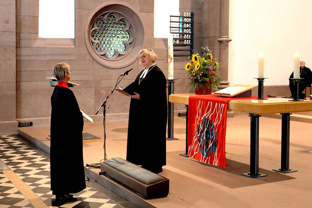 Landesbischöfin Dr. Heike Springhart dankte Dekanin Schäfer für ihren Einsatz und entpflichtete sie von ihrem Dienst u.a. mit dem gemeinsam gesprochenen Wunsch: „Wenn dich der Abschied schmerzt und du unsicher bist wegen all des Neuen, so beten wir, dass du darin getröstet und gestärkt wirst.“